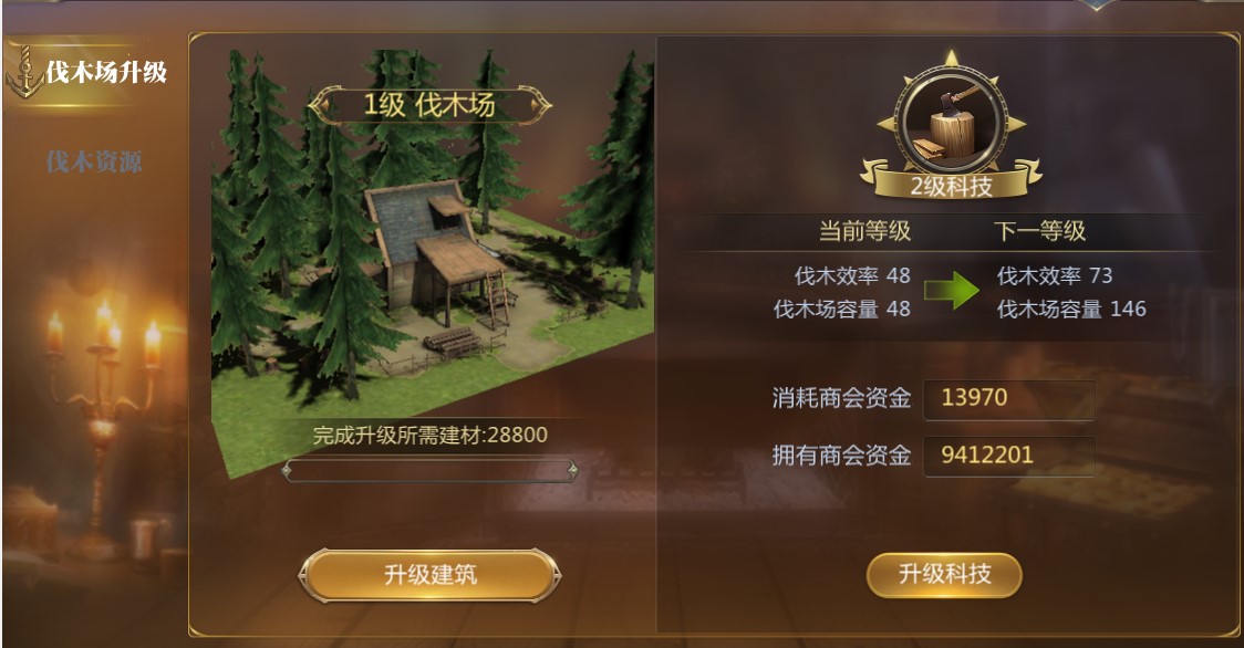 商会建筑的升级离不开建造材料,伐木场的建立为商会提供了建筑建造的材料保证,每个商会成员均可定期前往伐木场界面内提取自动生成的建材。对伐木场进行升级更可增加整体的生产效率与建材存量。