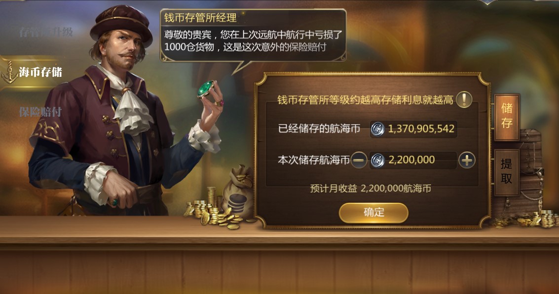 钱币存管所是商会的“保险公司”,为商会成员提供存钱服务。船长们可以在这里存储一定数量的航海币,并定期获得收益。当科技升到一定程度后,钱币存管所还会解锁航海保险,保护商会成员在跑商中遇到火灾等损失货物的灾害时不会损失过于惨重。