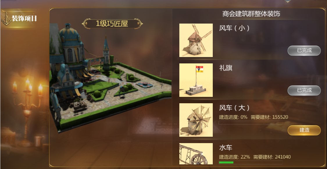 在巧匠屋中,商会成员可以根据心意,对商会建筑进行装扮,伴随主建筑的升级,这里将提供越来越丰富的装扮物,让商会更有风格和气魄。商会的能工巧匠们,是时候展现真正的技术了!