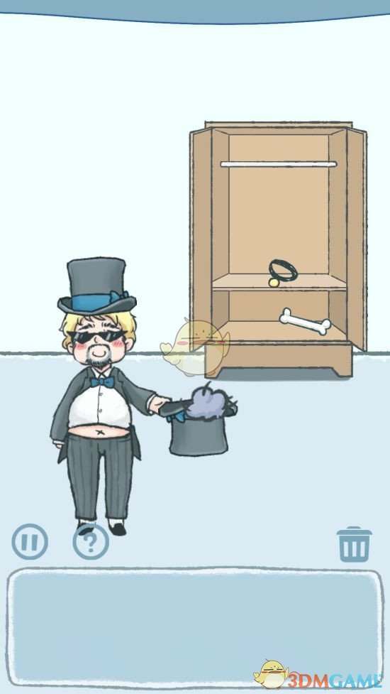 打开柜子,拿到猫毛,然后把猫毛放到大叔的帽子里,再点击大叔头上的帽子会出现标识,把标识放到左边中间,然后点击标识进入左边房间,合上柜子后发现柜子边上的魔棒,用魔棒点击大叔,大叔消失,帽子掉到地上,再点击帽子小猫就会出现。