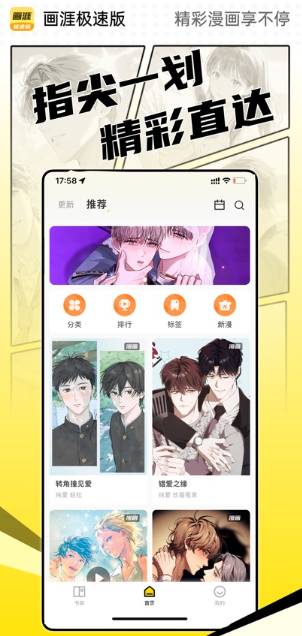 画涯极速版软件作为一款专为日韩腐女打造的漫画阅读神器,拥有海量资源,是漫画与小说爱好者的天堂。这里汇聚了上万部网络漫画与小说,每日实时更新连载,提供国内外高清漫画阅读体验,让你随时随地沉浸在精彩的二次元世界中。涵盖韩漫、日漫、国漫等多元风格,耽美漫画、宅男漫画、一耽漫画、腐漫画、BL 漫画等满足不同性向偏好,还有热血、彩虹、古风、漫蛙、原耽、脑洞、纯爱、真人、女神、恐怖、百合、武侠等丰富品类。无论你钟情于何种题材,都能在这里找到心仪之作。感兴趣的朋友不要错过下载。